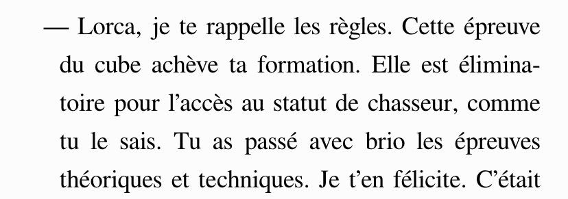 Sur plusieurs paragraphes, le professeur du personnage prénommé Lorca lui expose des règles en racontant le passé - ce que les scénaristes appellent la backstory - alors que tous deux le connaissent déjà.