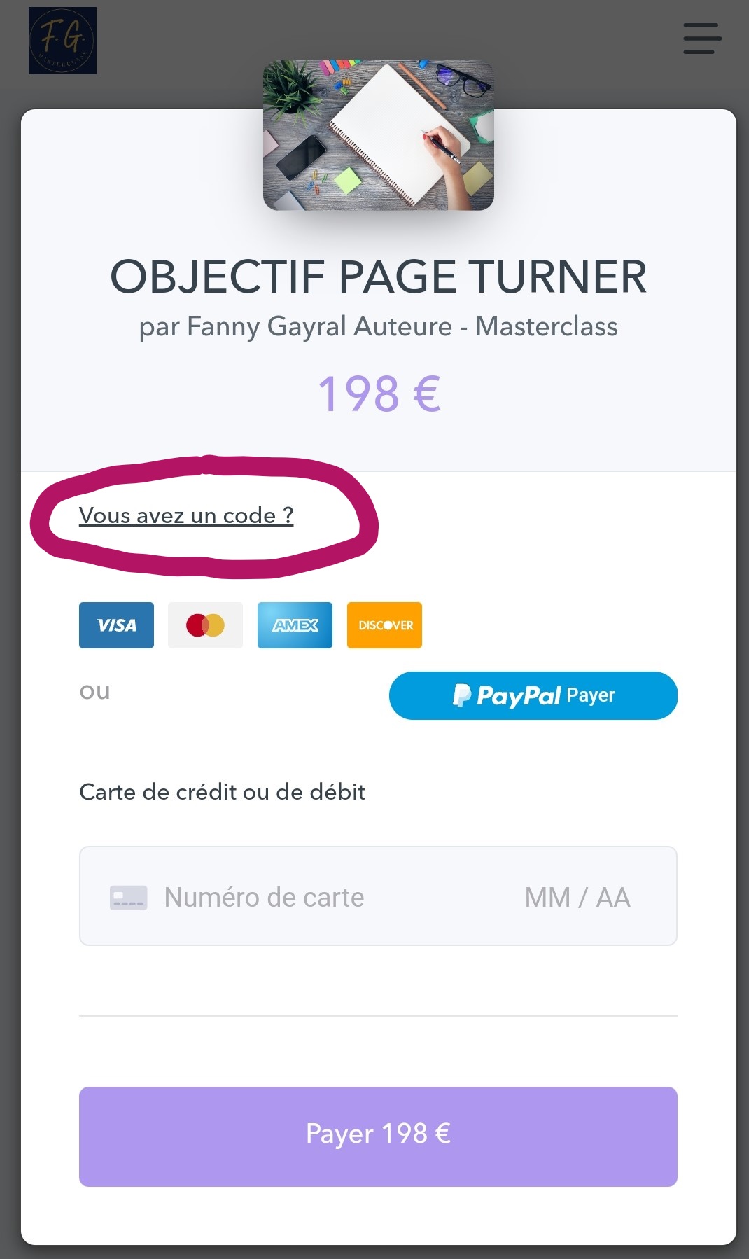 Après avoir créé votre compte avec votre email, vous accéderez à la fenêtre de paiement. Cliquez alors sur "Vous avez un code ?" et entrez votre code promotionnel pour que la réduction s'applique.